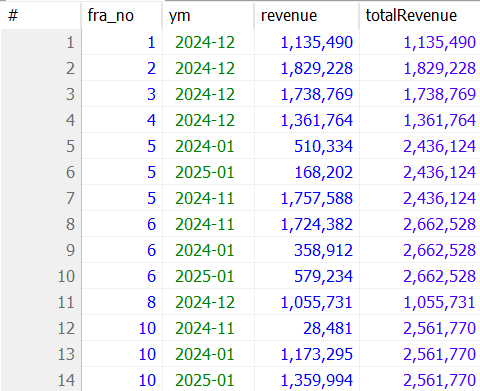 SELECT fra_no, ym , revenue , SUM(revenue) OVER(PARTITION BY fra_no) AS totalRevenue FROM sales; |
