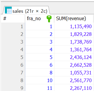 | SELECT fra_no , SUM(revenue) FROM sales GROUP BY fra_no; |