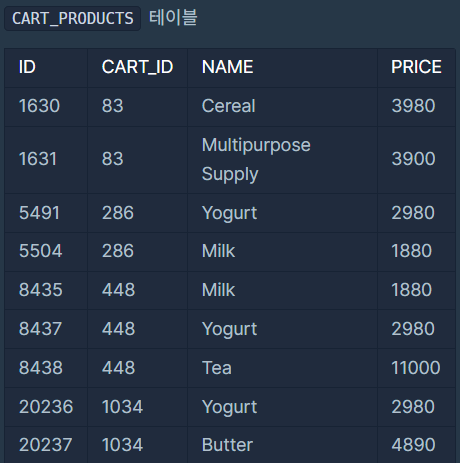 ※ 문제 요지 : CART_PRODUCTS 테이블에서 'Milk'와 'Yogurt'가 있는 CART_ID를 출력