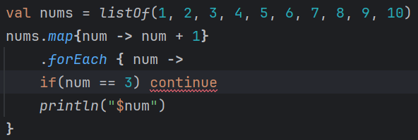 ① continue → @forEach : 코드의 .forEach 타이밍으로 빠져나간다.
